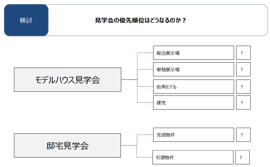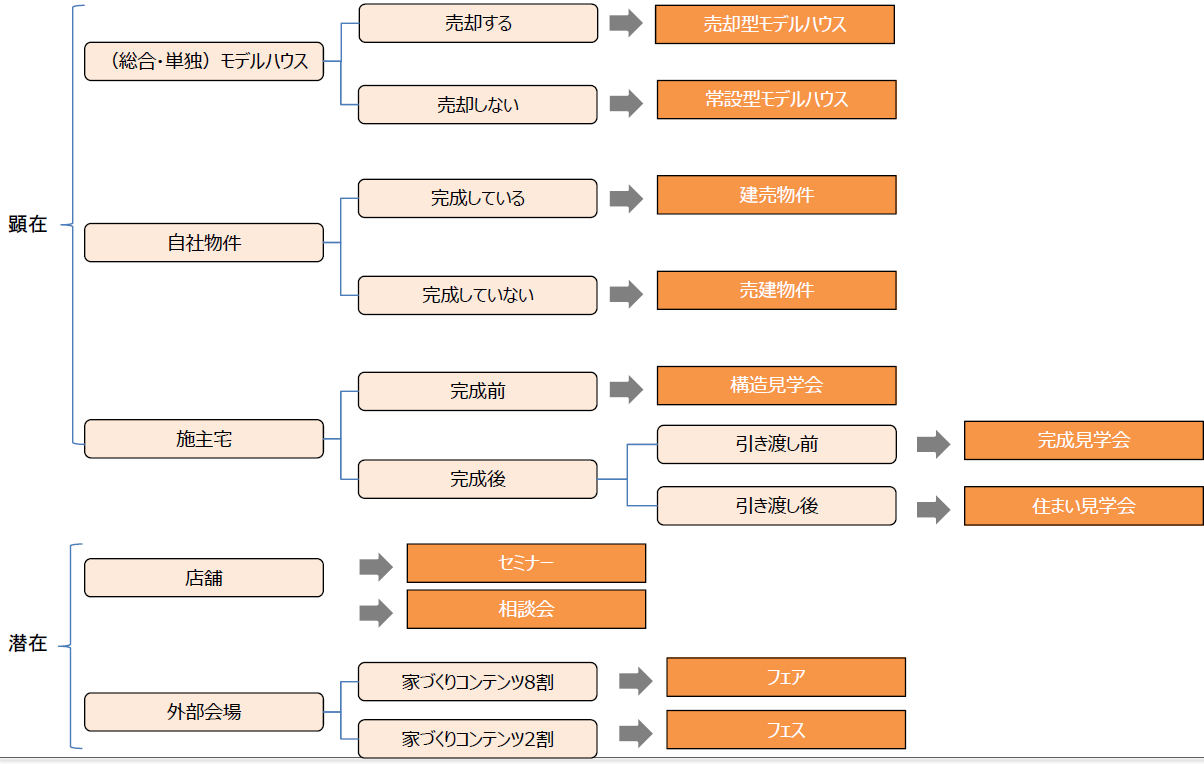 見学会に関しては、少なくとも6つのパターンがある。モデルハウスの見学会でいえば、「総合展示場」「単独展示場」「街角モデル」「建売」が存在する。邸宅見学会でいえば、完成した物件「完成見学会」と、すでに引き渡した物件で行う「住まい見学会」が存在する。