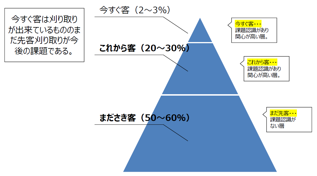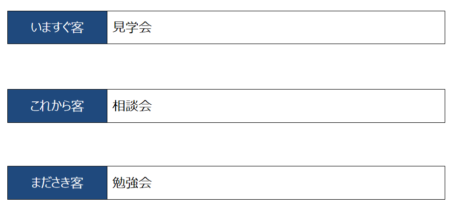 購入意欲の熱が高い層に対して、低い層が圧倒的に多いのである。当然ながら、いますぐ客には見学会が有効であるが、これから客においては相談会、まださき客においては勉強会といった形で、それぞれアプローチをしていく必要がある。