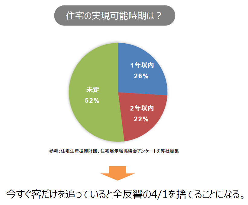 いますぐ客は全体の2~3%、これから客は20~30%、まださき客は50~60%存在する。そして下の図にあるように、住宅の実現可能時期については、いますぐ客(1年以内)が26%、これから客(2年以内)が22%、まださき客(未定)が52%である。