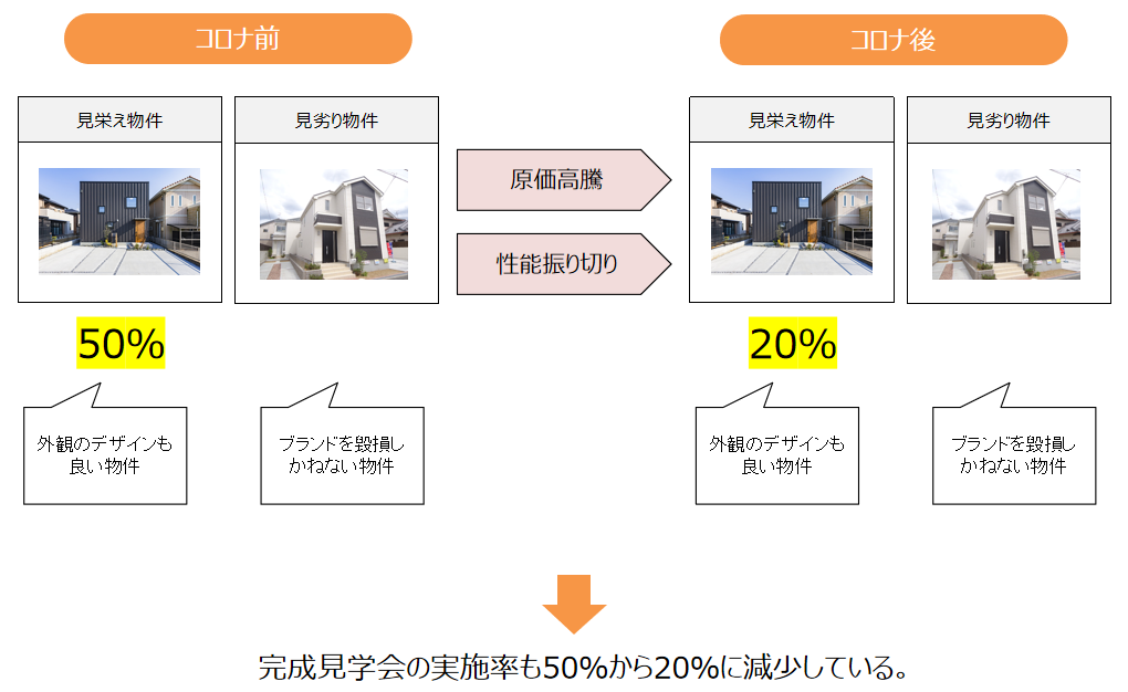 当然、ブランドを毀損しかねないような、外観にお金をかけていない見劣り物件というものも存在するが、完成物件の2軒に1軒は見栄え物件であり、そこで比較的来場の確保ができていたのである。しかし、コロナ後に様相が変わった。原価が高騰したり、性能に予算を振り切ったりするケースが増え、見栄え物件が減少し、見劣り物件が増えてしまったのである。その結果、完成見学会自体の実施率が減り、無理に見劣り物件で見学会をしても来場がない、という結果につながっている。