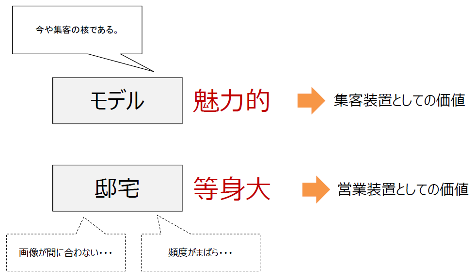 従来は、モデルハウスよりも邸宅見学会の方が集客効率が良い傾向にあった。しかそ、現在は下の図にあるように、邸宅に関しては等身大の住宅を見せる、いわば営業装置としての価値となり、集客においてはモデルハウスを活用するといった逆転現象が起こっている。