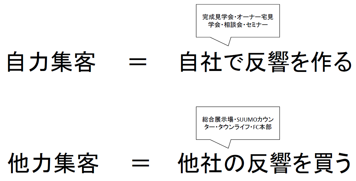 次に、総合展示場はどうだろうか。我々は、総合展示場を「他力集客」と表現している。改めて言葉の定義を紹介すると、「自力集客」とは、自社で見学会や勉強会、相談会を開催することである。一方で、「他力集客」とは、他社が集めた名簿を買うという考え方で、総合展示場が該当する。
