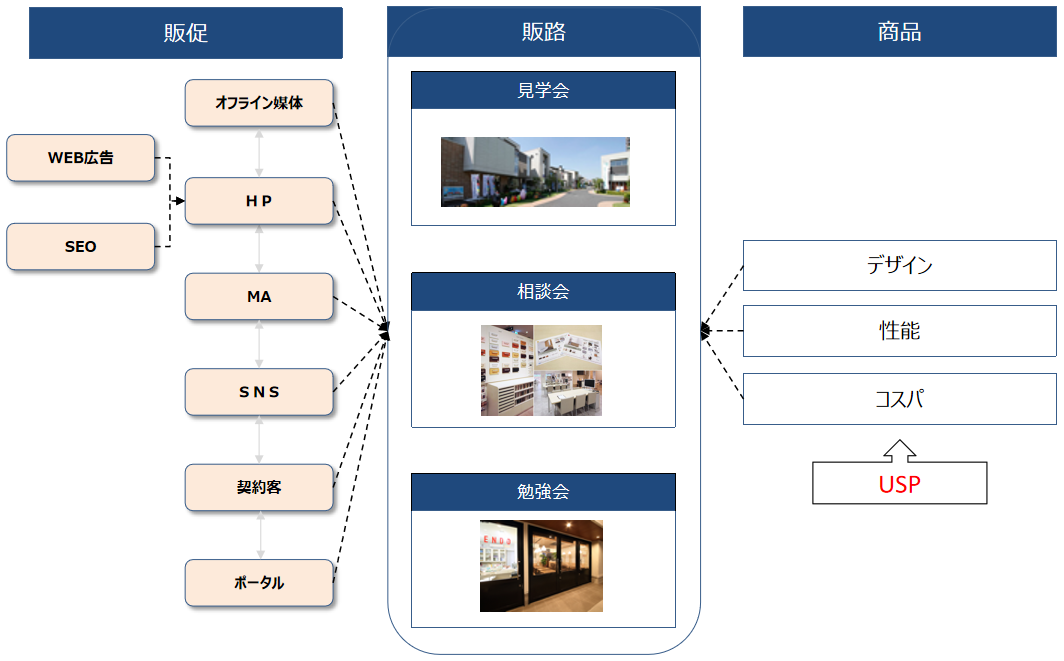 販促とは、チラシやホームページ、WEB広告、 SEOなど、自社を認知してもらい、来場につなげるための「入口」のことである。販路というのは、見学会や相談会、勉強会などのイベントを指すが、この図でいえば、入口から来た見込み客を呼び込む「出口」に位置づけられる。多くの住宅会社が、マーケティングといえば販促のみと捉え、イベント自体を最適化するというところが弱い。