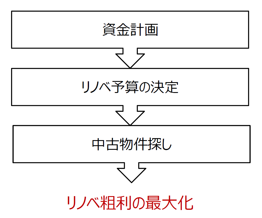 具体的には、資金計画から始め、リノベーションにかける予算を決定し、それに合致する中古物件を探していくという流れである。