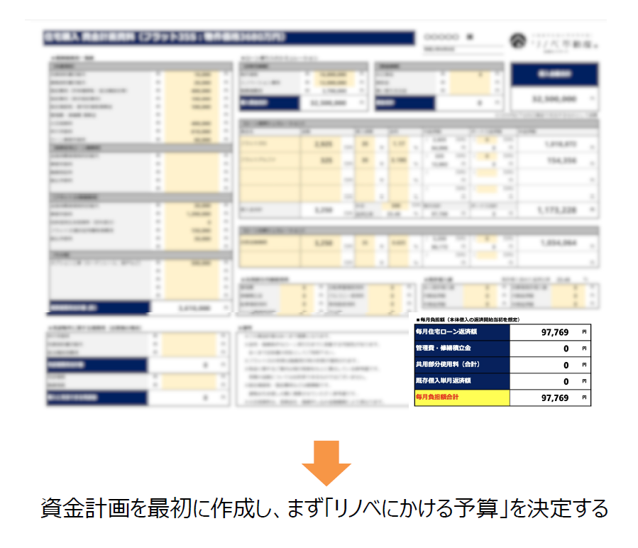 S社では、下の図のように、まず資金計画を作成し、リノベーションにかける予算を決定した。