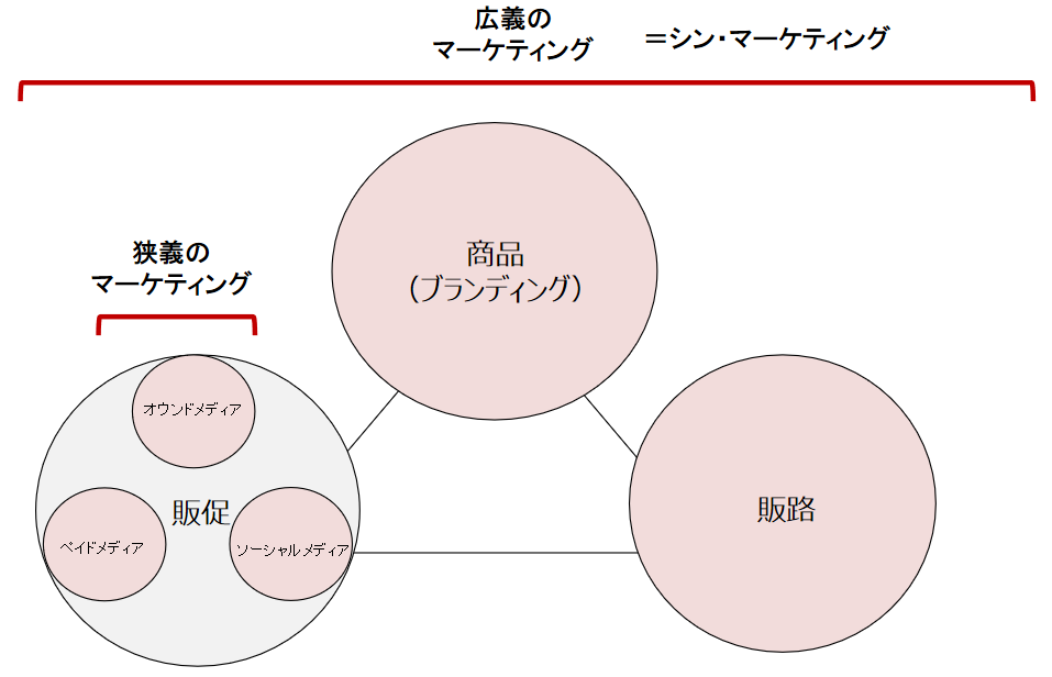 ここでも繰り返しになるが、一般的にマーケティングと捉えられている販促領域だけでは成果は出ない。シン・マーケティング戦略こそが重要である。では、そもそも日本において、なぜマーケティングが販促と誤って解釈されてしまったのだろうか。それは、マーケティングという概念をアメリカから日本へ持ち込んだ主体が、テレビCMなどの販促を手掛ける大手広告代理店だったためである。