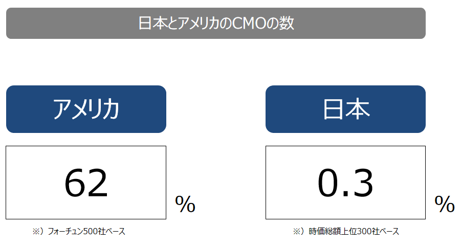 にも関わらず、誤った定義のままマーケティングが広まってきたことが、この30年の停滞の一因になっていると私は考える。こうした状況の中で、シン・マーケティング戦略を広げていくことが私のミッションである。下の図にあるように、日本ではCMOという役職がアメリカと比較して圧倒的に少ないが、このCMOをシンマーケティング領域の責任者として増やしていきたいと考えている。これは私の人生を賭けた試みである。