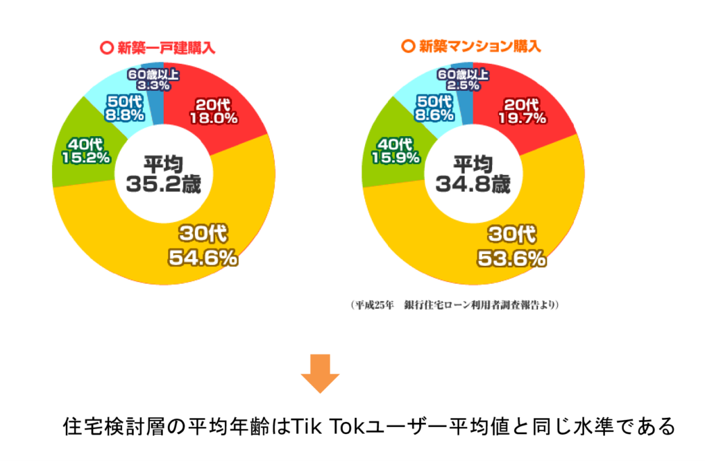 TikTokは、一般に若年層向けのSNSと考えられているが、実際のユーザーの平均年齢は34歳と比較的高く、住宅の一次取得層に近い。