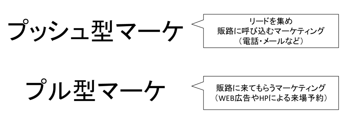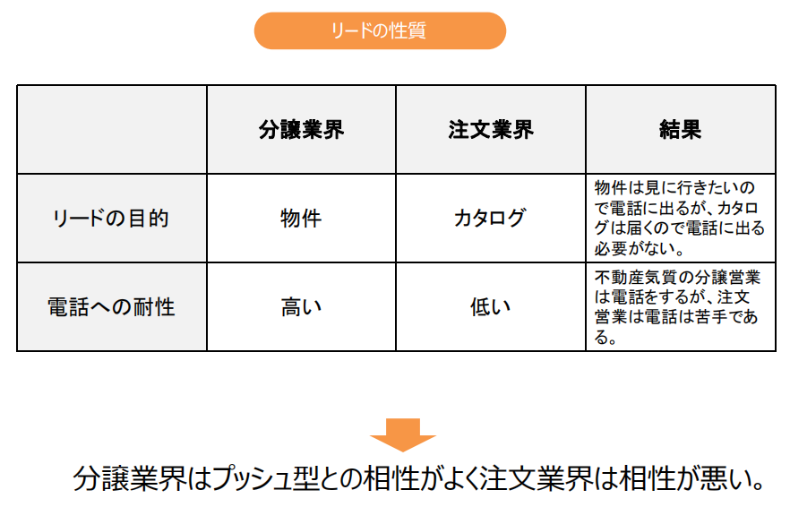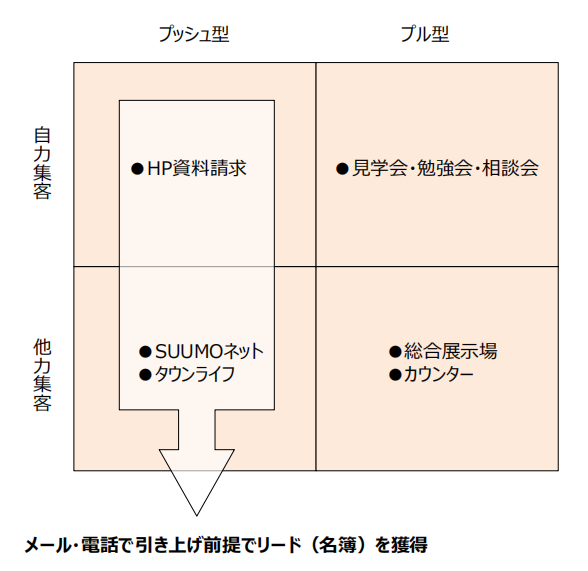 住宅業界のマーケティングには、「プッシュ型マーケ」と「プル型マーケ」が存在する。プッシュ型とは、資料請求などでリードを集め、自社から電話やメールでアプローチして販路に呼び込む手法である。