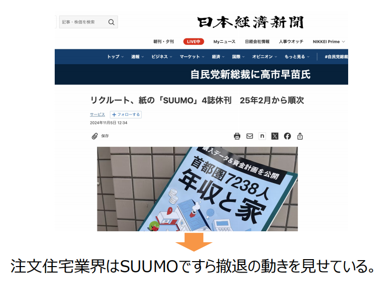 一方、注文住宅の営業は断られることへの耐性が低く、積極的に電話をかけることをためらいがちだ。このような背景から、分譲業界は「資料請求や会員登録でリードを集め、電話でアプローチする」プッシュ型マーケと相性が良く、注文住宅業界はそれに不向きであるといえる。実際、SUUMOでは注文住宅分野の不振が続き、雑誌が休刊となった事例もある。