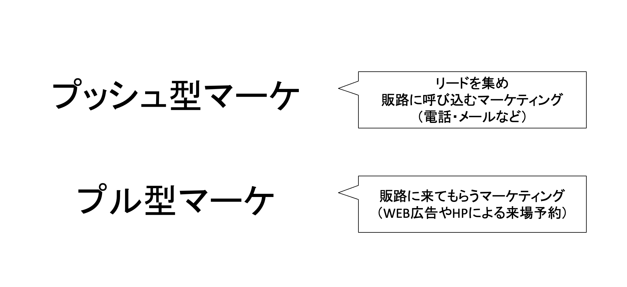 まず、前提として、住宅業界の販路における戦略は様々な観点で議論されているが、ここでは特に「プッシュ型マーケ」と「プル型マーケ」というマーケティングの観点について見ていきたい。プッシュ型マーケは、資料請求や会員登録などでリード(名簿)情報を集め、それらに電話やメールなどで積極的にアプローチし、販路へと促す手法である。