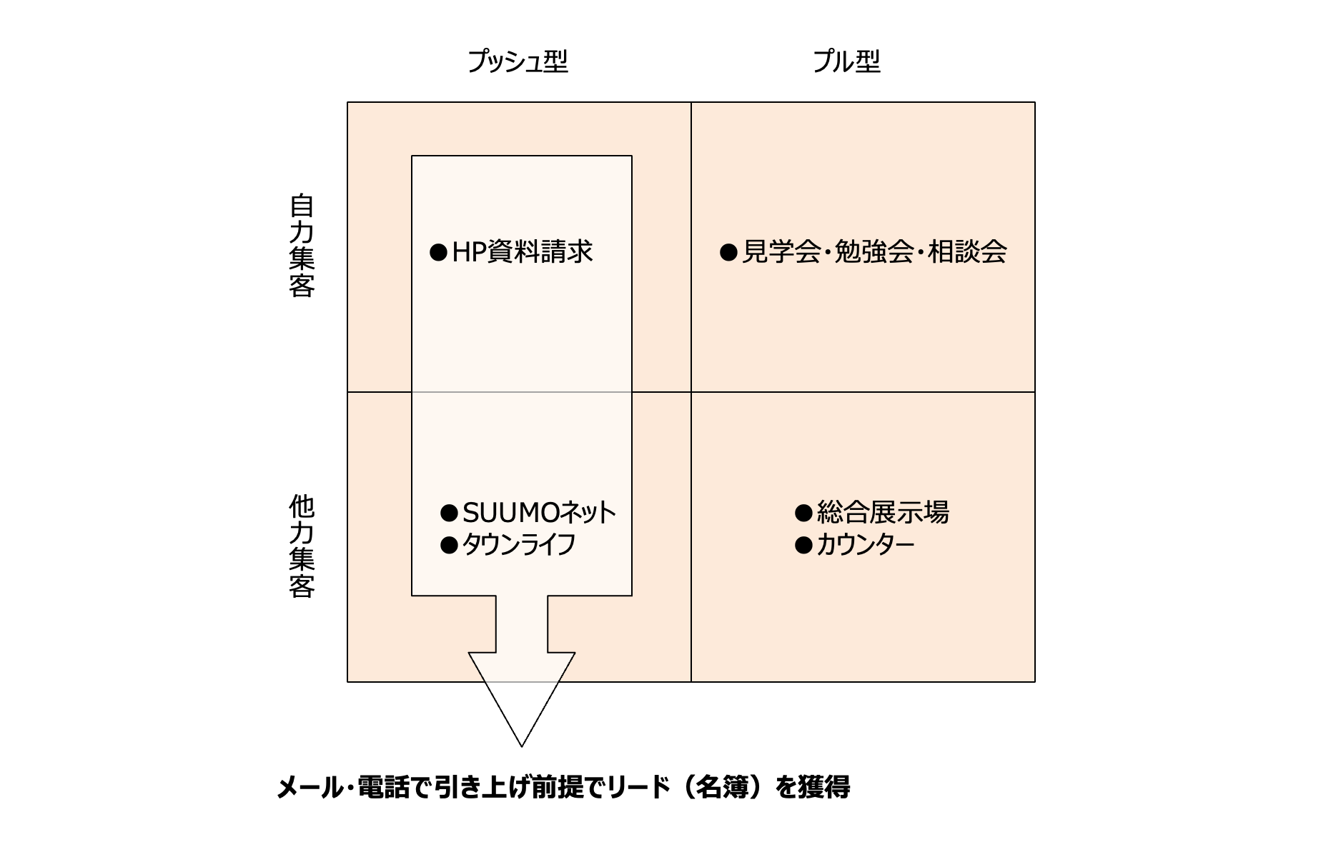 一方、プル型マーケは、ウェブ広告や自社ホームページによる来場予約などで、顧客が自発的に販路に来てもらうことを促す手法である。これらを自社の集客と他社の集客という観点で分類すると、下の図のようになる。プッシュ型においては、ホームページの資料請求やSUUMOネット、タウンライフなどから名簿を獲得し、これらを引き上げ前提のリードとして、電話やメールを用いて来場につなげていくのである。