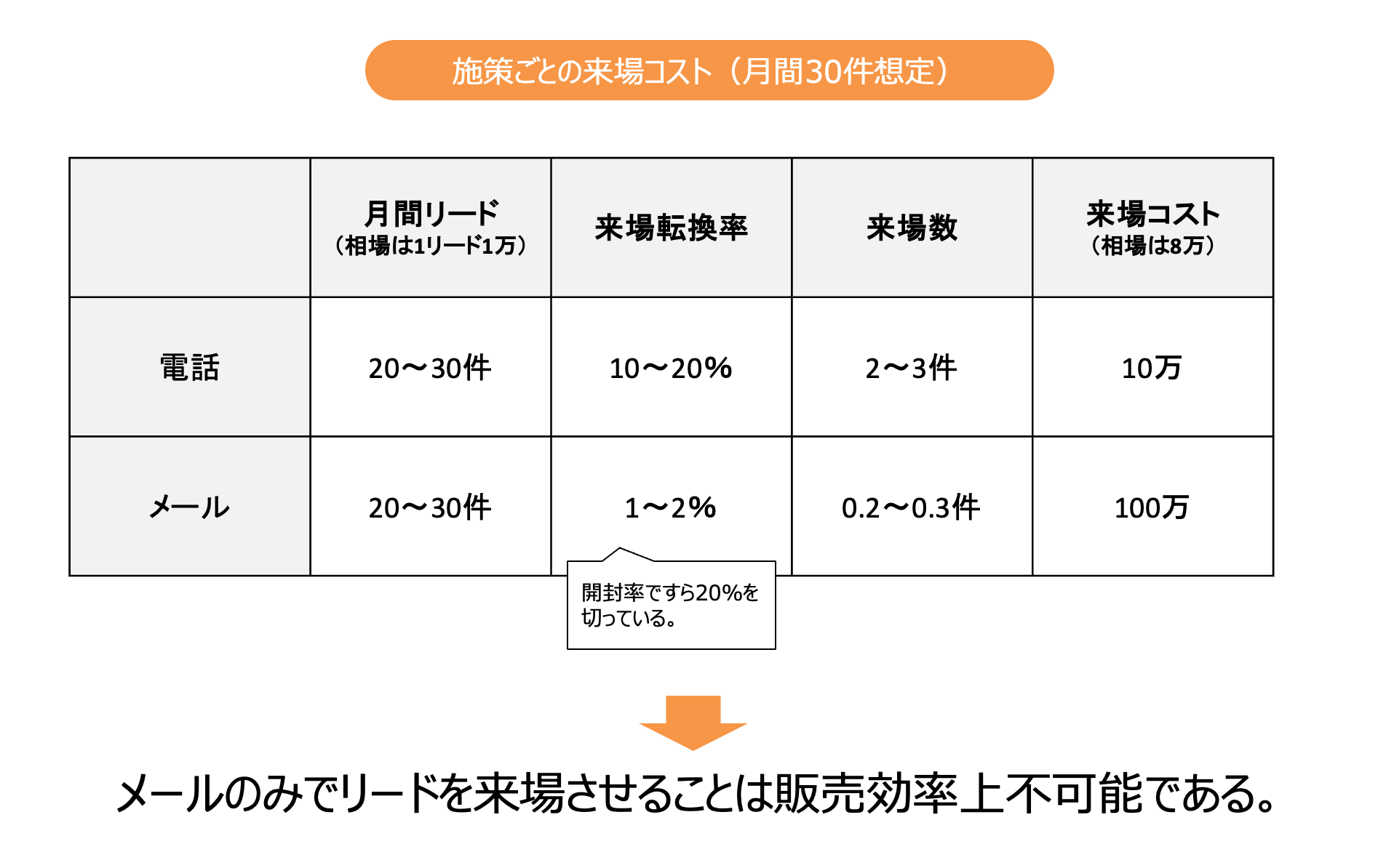 では、メールの場合はどうだろうか。同じくリード相場が1件1万円で、20件から30件のリードがあったとする。この場合の来場転換率は、メールでは1%から2%と非常に低い。そもそもメールは開封率ですら20%を切っているため、来場転換率が低くなるのは当然である。このような状況では、月間来場数は0.2件から0.3件となり、一来場コストは100万円を超えてくる。となると、来場コストが全く採算に合わないため、プッシュ型施策においては電話でのアプローチが必須なのである。