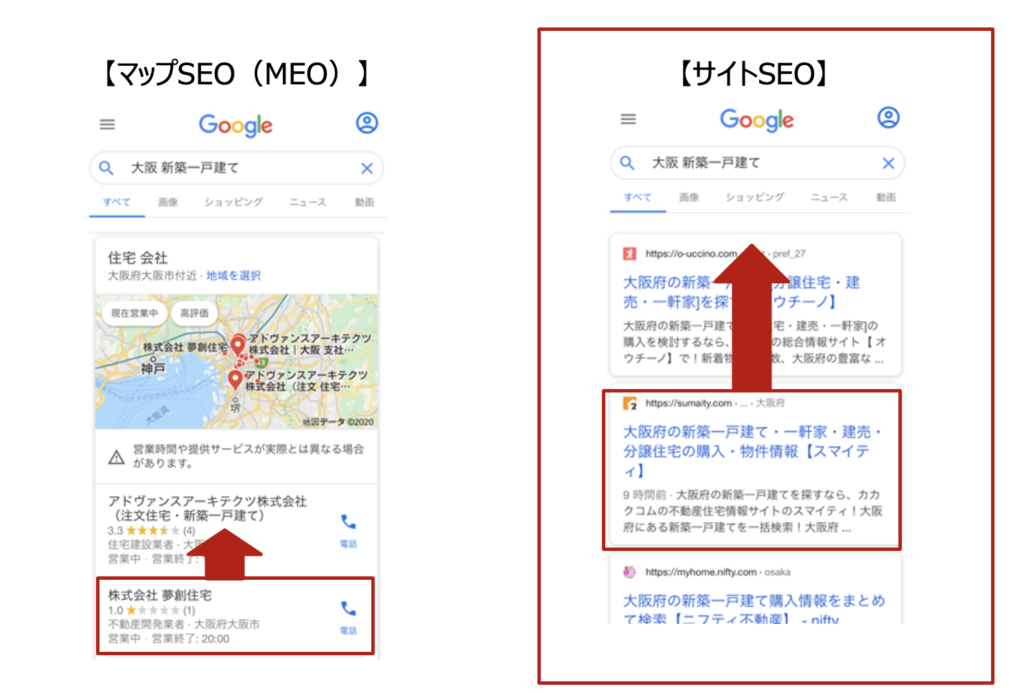 また、下の図のようにマップに店舗情報を上位表示させるMEOと、一般的なSEOがあります。今回はこの一般的なSEOについて触れてみたいと思います。