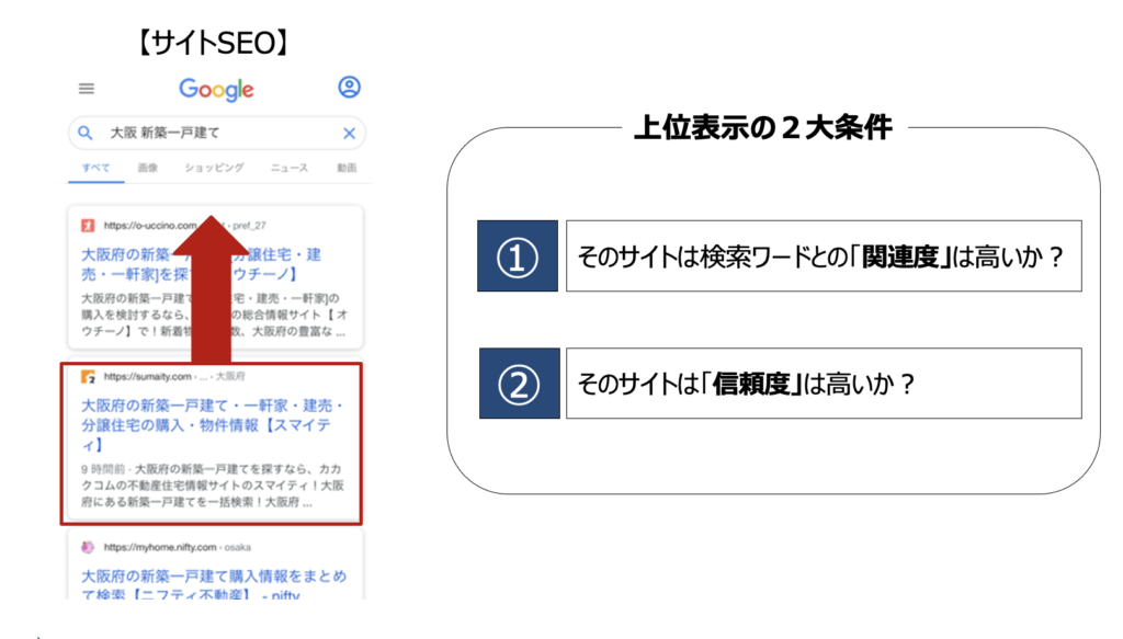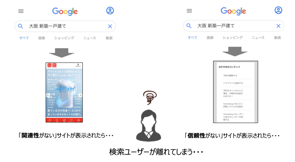 例えば下の図のように、大阪新築一戸建てで検索したのに全く関連性のないサイトが表示される、あるいは同じような検索で信頼性がないサイトが表示されると、ユーザーが離れてしまい、収益がなくなってしまいます。
