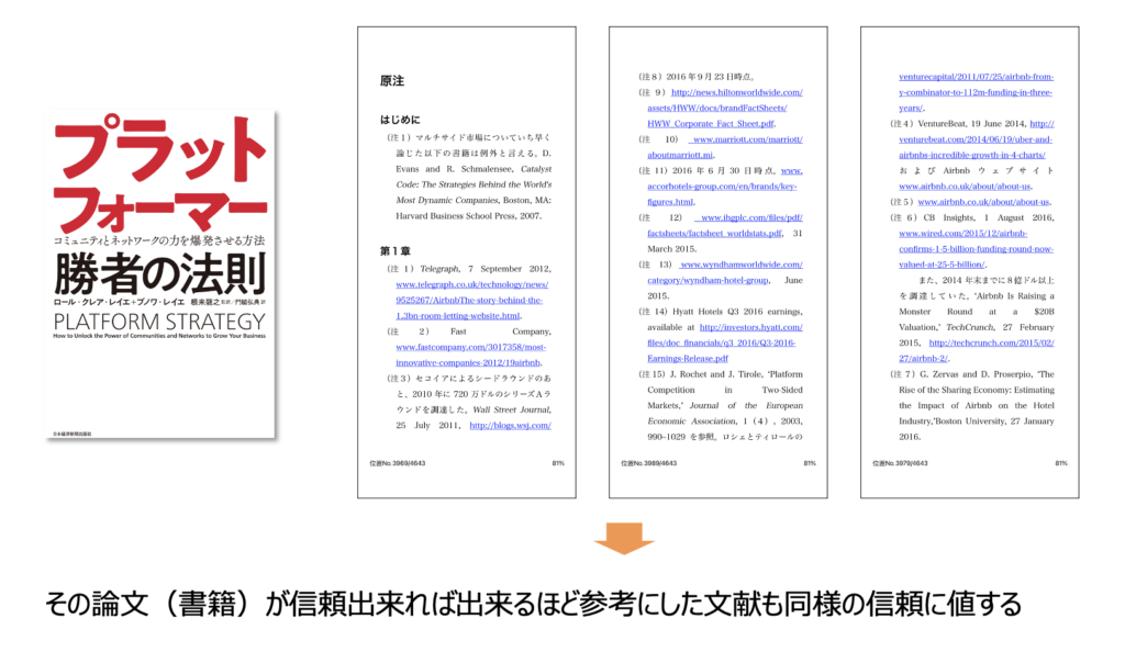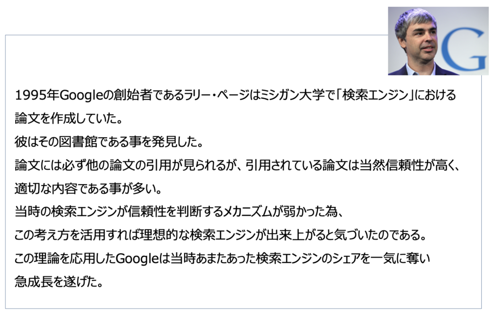 Google創業者のラリーペイジ氏が図書館でタイトルの重要性について発見をしたお話をいたしましたが、彼はもう一つ発見をしていました。論文には必ず他の論文の引用が見られるということです。書籍などもそうですが、参考文献があとがきに記載をされているところを見たことがないでしょうか。