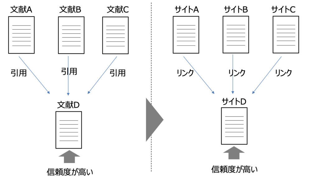論文A・B・Cがあったとします。それぞれの論文が、引用している文献Dに信頼性がなければその論文自体も評価されませんのでその文献Dの信頼性は高いと言えるでしょう。同じくサイトA・B・CがサイトDの情報を引用していれば(引用=リンク)、そのサイトの信頼度は高くなります。