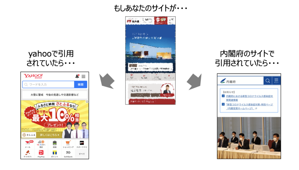 ですから、下の図のように、もしあなたのサイトが信頼性の高いYahooや内閣府サイトに引用(リンク)されていると、あなたのホームページは信用度が高いと判断されるのです。