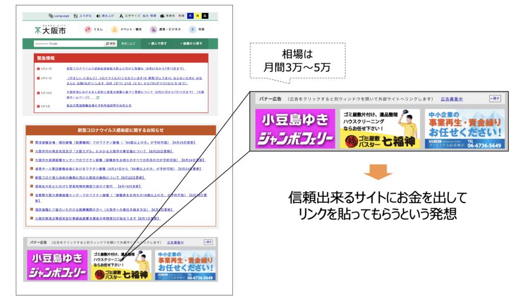 このような考え方を踏まえて、全国の役所では下の図のように、リンク掲載枠を用意しています。Googleからすれば、信頼性のある役所サイトがリンクしているサイトは信頼し、表示順位を引き上げます。