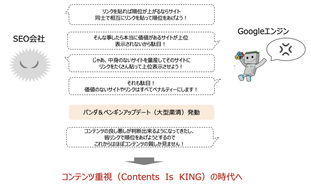 そうすると、SEO会社は「中身のないサイトを量産し、そのサイトにリンクを貼って上位表示させよう」ともくろみました。Googleはその取り組みに「価値のないサイトやリンクは全てペナルティにする」と大型の地殻変動を起こしました。この地殻変動で多くのサイトが村八分となりました。