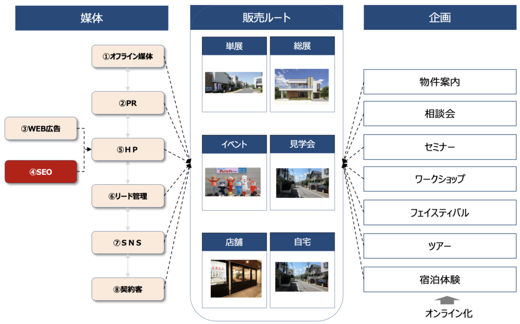 まず、住宅業界の集客構造の中で、SEOがどのように位置づけられるかを触れてみたいと思います。下の図をご覧ください。
