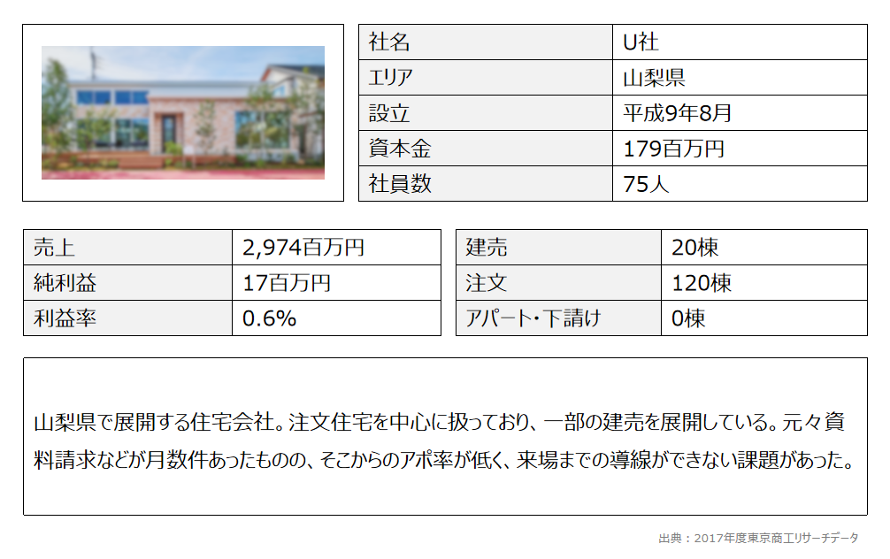 今回は、資料請求からアポ率を5倍にした山梨県U社の事例を見ていく。この会社は注文住宅を中心に扱っており、一部で建売を展開している住宅会社である。