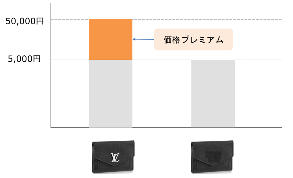 あなたなら、それぞれいくらで買うだろうか。そして、その理由は何だろうか。おそらく、多くの人が左側の財布に高い値をつけるのではないだろうか。このように、素材や原価が変わらなくても金額が上がることを「価格プレミアム」と呼ぶ。