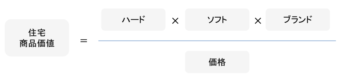 このような価格プレミアムを醸成することこそがブランディングであるが、「ブランディング」という言葉が独り歩きしているように思う。そもそもブランディングとは、住宅商品の価値を「価格」を分母として、ハード・ソフト・ブランドに分けた際の付加価値の一つである。