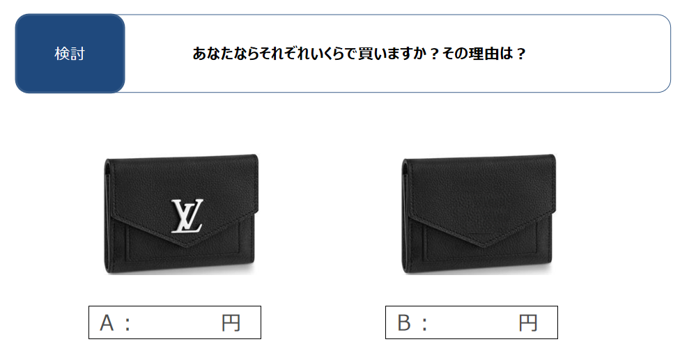 まず、ブランディングとは何かについて述べていく。例えば下の図は、ある有名ブランドのロゴが入った財布と、そうでない財布を並べたものである。