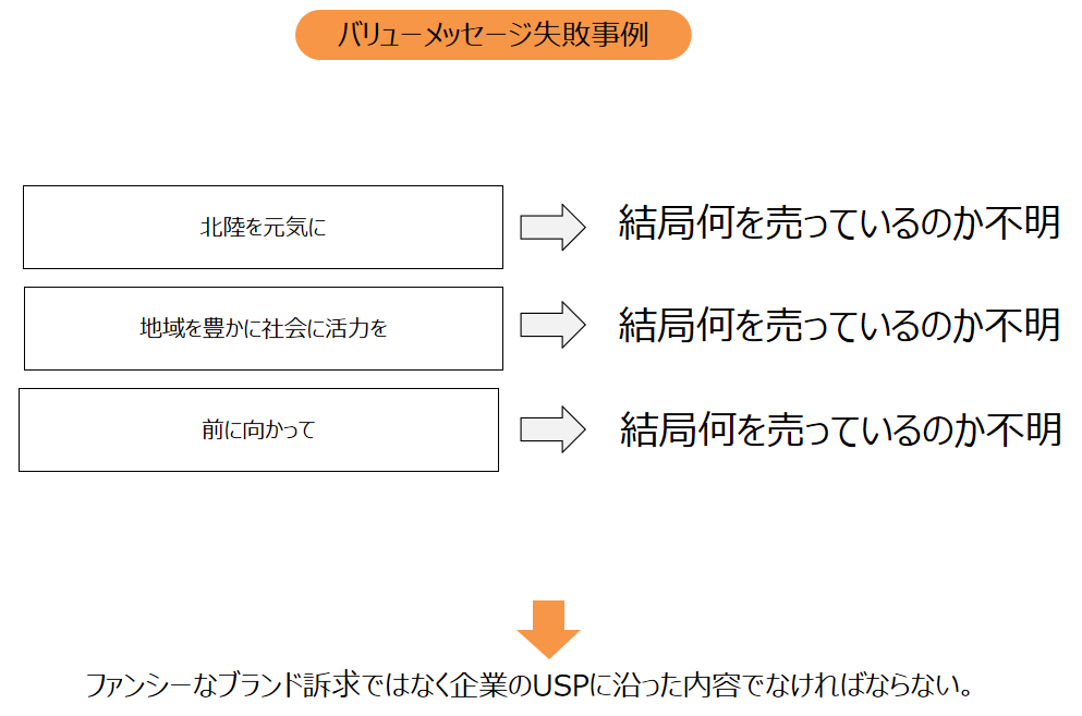 このUSPを明確にし、顧客とのタッチポイントに自社のUSPを展開していくことこそがブランディングである。また、USPの核となるバリューメッセージは、下の図のように、USPに沿った内容であることが適切である。