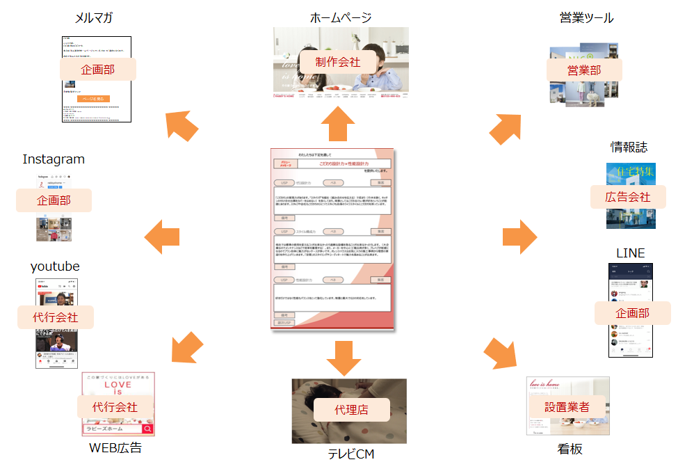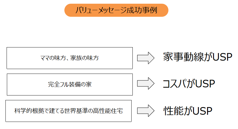 例えば、家事動線がUSPの場合は「ママの味方、家族の味方」、コスパがUSPの場合は「完全フル装備の家」、性能がUSPの場合は「世界基準の高性能住宅」といったものになる。