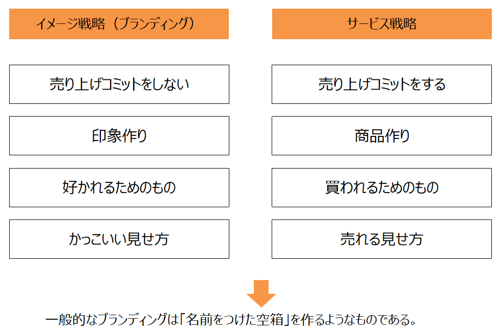 こうした状況の中で、多くのブランディングに関わるコンサルティング会社は、売上にコミットすることを避け、イメージ戦略の取り組みに偏る。このような取り組みは、名前を付けた空箱を作るようなもので、無意味である。今後、ブランディングという観点を押さえるには、サービス戦略として売上に関わる側面を持つ必要がある。外部に委託する場合は、どれくらい売上にコミットし、どれくらい売上を保証をしてくれるのかを確認してからプロジェクトを進めるべきだ。