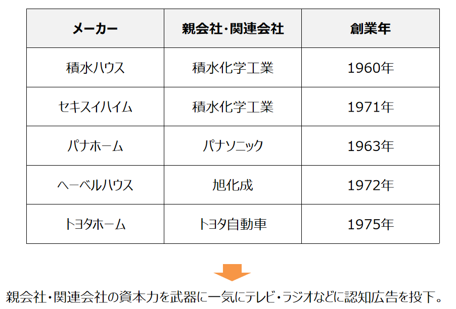 大手ハウスメーカーは、1960年代に台頭したが、当時の販促施策といえばテレビCMくらいしかなく、親会社の資本力によって大幅なコストを投じて放映した。その結果、ブランドが構築されたのである。