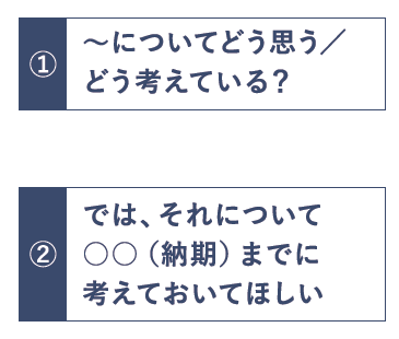 部下の考えに不足や誤りがある場合は、まずその意見を受け止めた上で、上司が不足している部分を補うようにしよう。特に、アドバイスの内容に拘束力を持たせたくない場合は、部下自身に考えをメモさせ、上司も同じ内容を記録しておく方法が有効である。これにより、後からお互いの進捗を確認する際に活用できる。