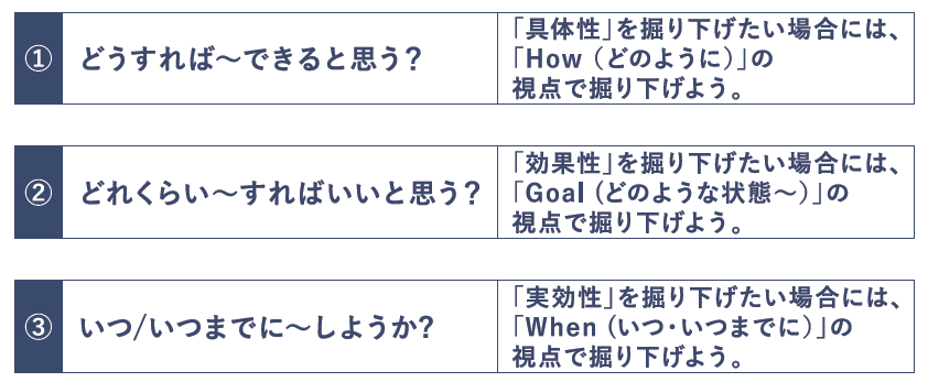 部下は通常、上司よりも問題を掘り下げて考える力が弱い場合が多い。この点について、部下の能力に問題があると捉えることもできるが、部下の能力を引き出すことも上司の重要な役割の一つであると考えたい。なお、下の図にあるように掘り下げ質問には三つの種類がある。