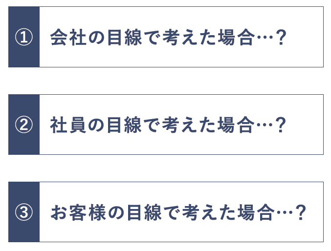 いつも同じ視点で考えさせているだけでは、せっかく部下の中に芽生えている可能性があっても、いつまでたっても開花しないだろう。切り替え質問によって、部下の考えをより活性化させていくべきである。視点を変える方法として、会社・社員・お客様の3点が挙げられるが、それぞれの立場で考えることで、新たな発想が生まれやすくなるのである。