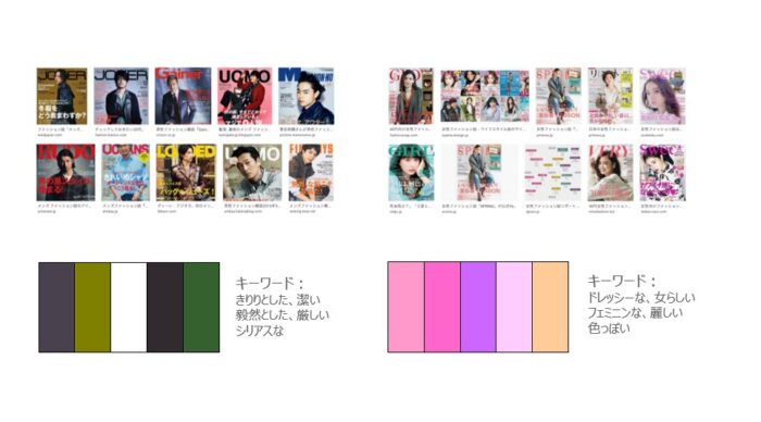 男性ファッション誌ではシックな色合いが多く使われ、女性ファッション誌では比較的明るめな色が使われていることが分かる。男性ファッション誌は「きりりとした・潔い・毅然とした・厳しい・シリアスな」といったイメージを打ち出している一方で、女性ファッション誌は、「ドレッシーな・女らしい・フェミニンな・麗しい・色っぽい」などのイメージを持たせる色合いでまとめられている。好感度を意識するのであれば、女性に好かれるこのような色合いを活用した広告展開が重要になる。