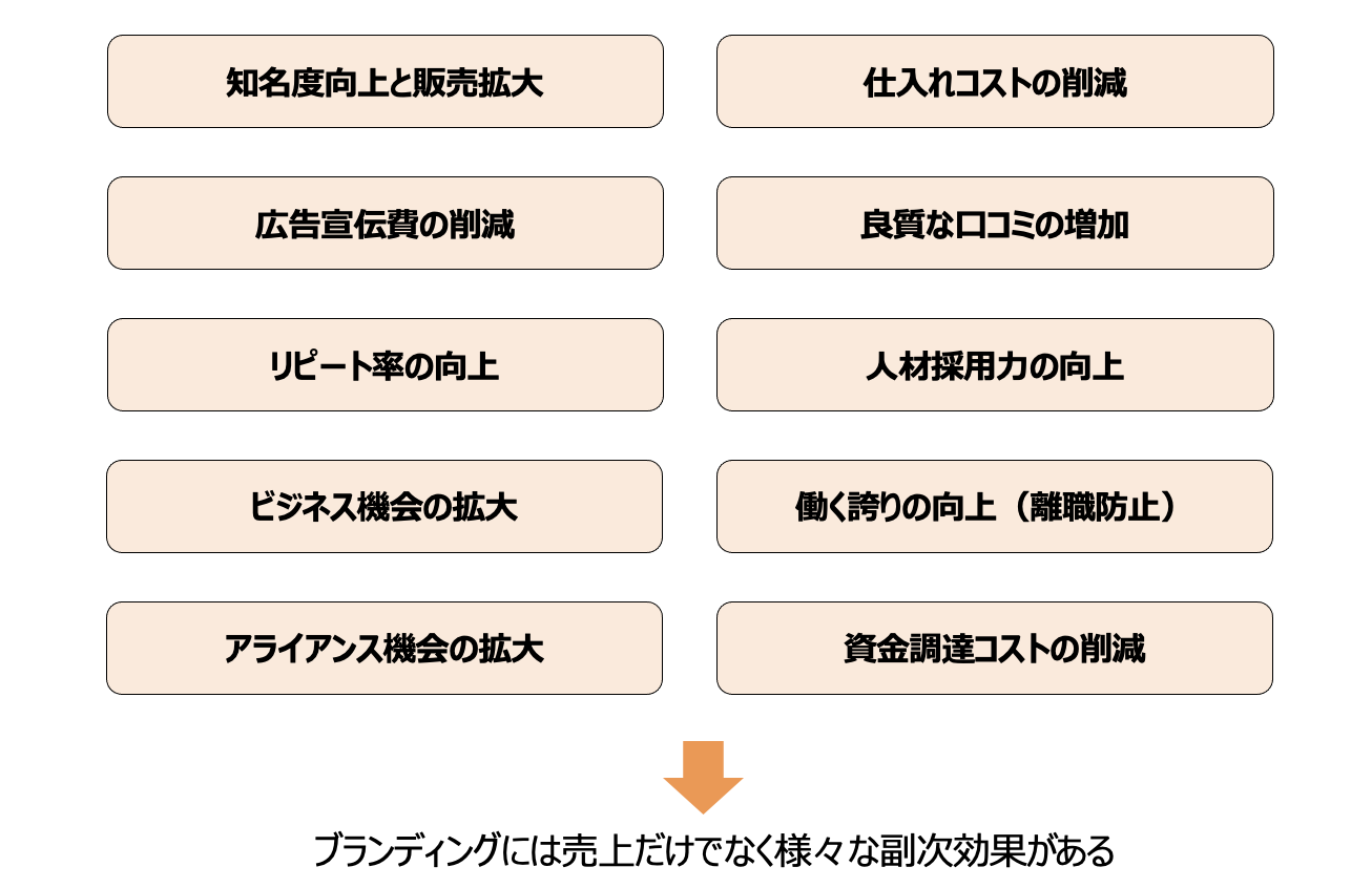 ブランドの副次効果としては、下の図にあるように、知名度向上や販売拡大、広告宣伝費や仕入れコストの削減、資金調達コストの削減など、さまざまな効果がある。