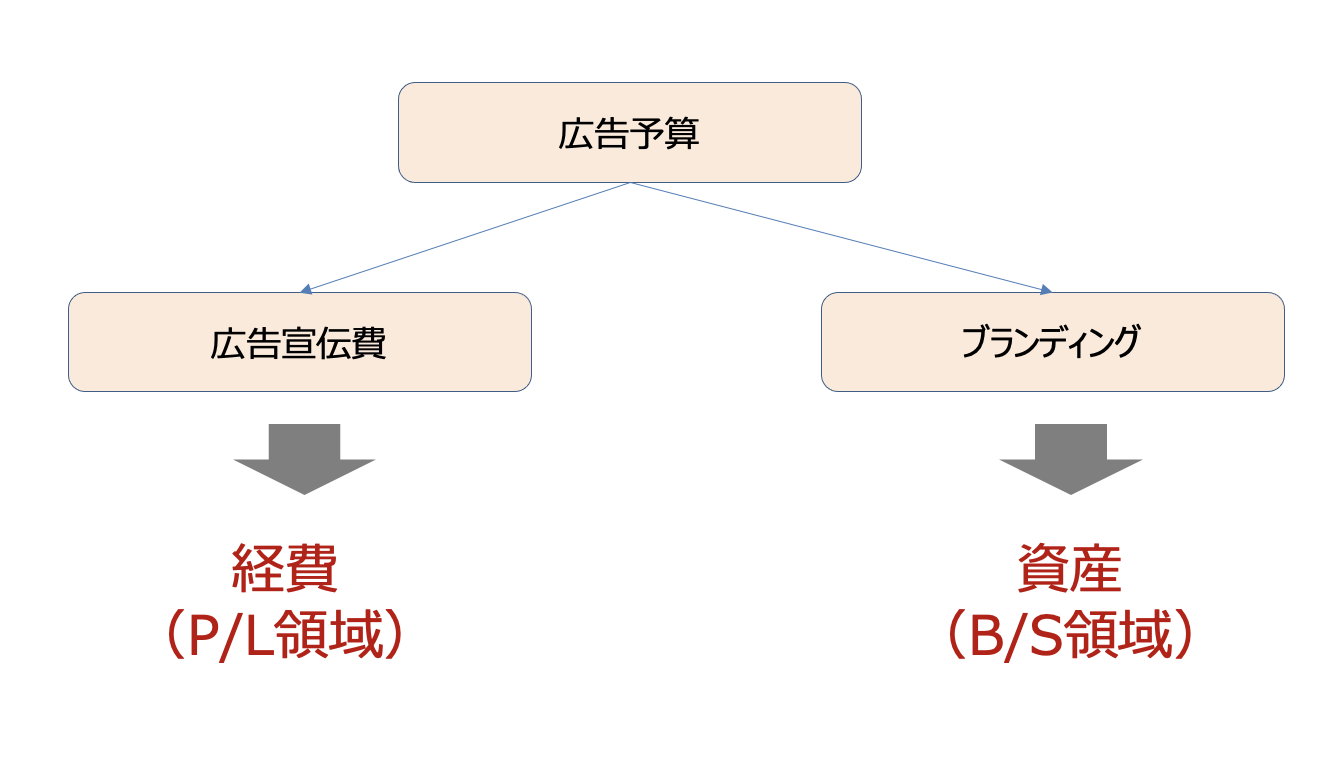 また、広告予算という広いくくりで分類すると、一般的な広告宣伝費は経費であり、PLの領域である一方で、ブランディングは資産になるため、BSの領域になる。