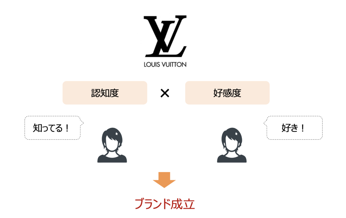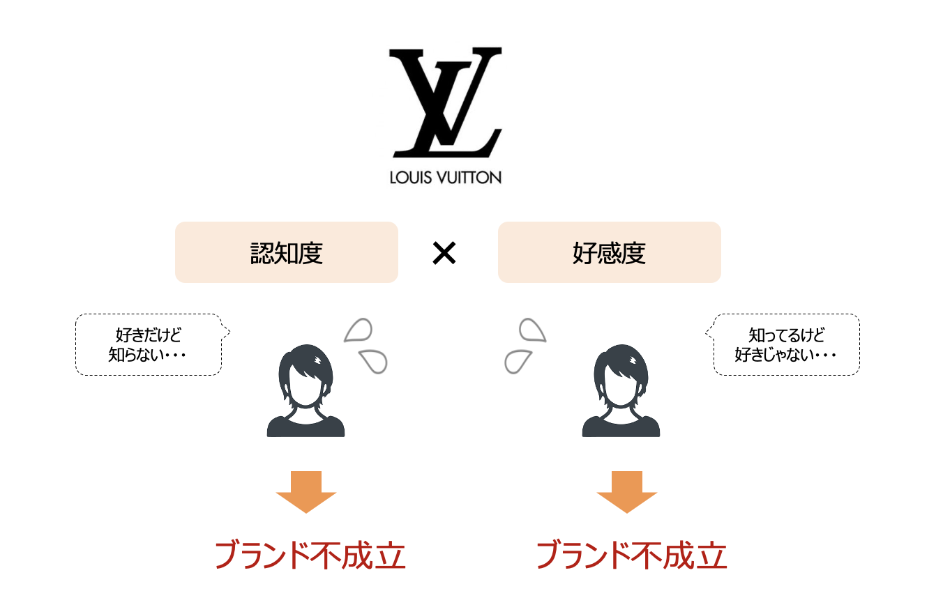 例えば、ルイ・ヴィトンというブランドに対して、認知度も好感度もあればブランドは成立する。しかしながら、「好きだけど知らない」といった認知度の欠如や、「知ってるけど好きじゃない」という好感度の欠如があった場合は、いずれもブランドの成立とはならない。