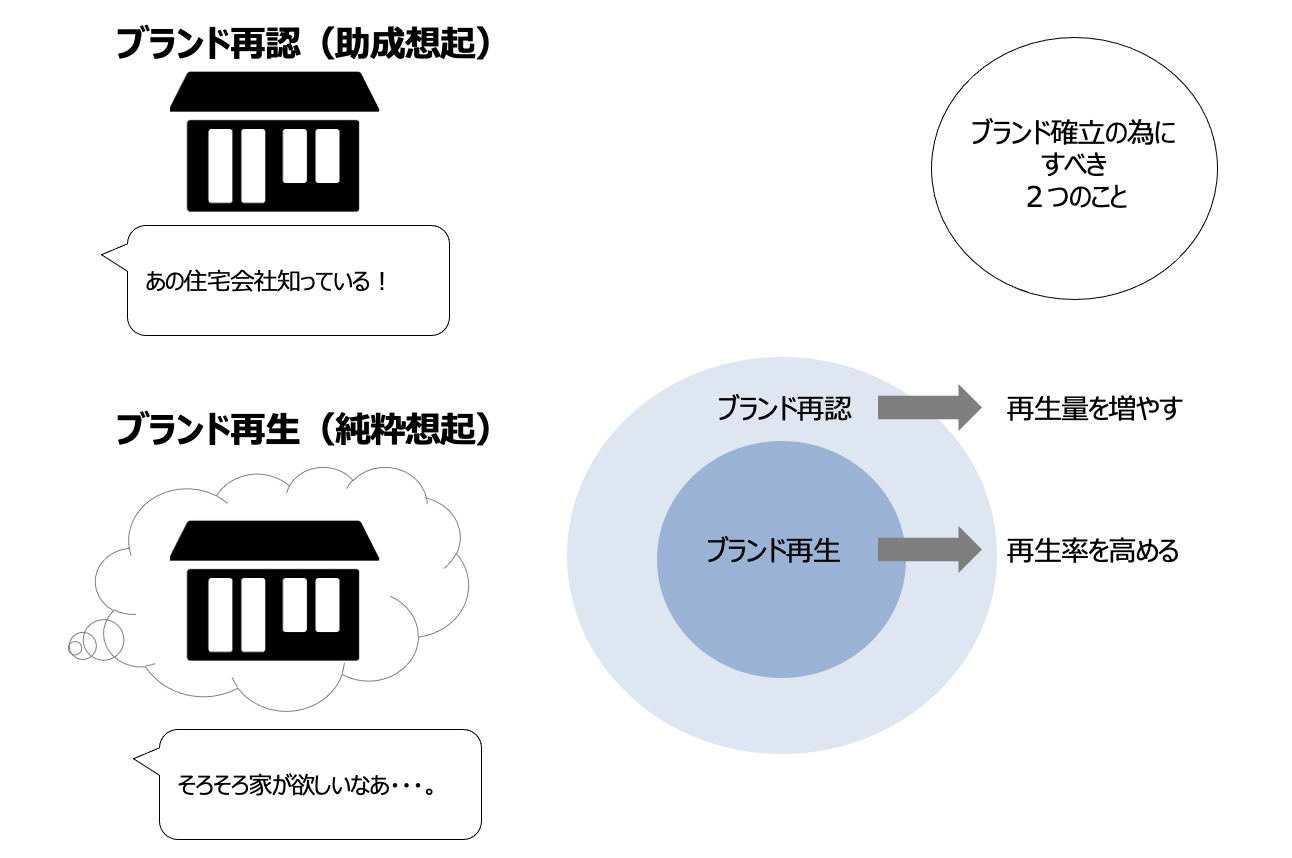 助成想起とは、あるブランドのロゴを見たときに、その会社を知っていると思ってもらうことである。対して、純粋想起というのは、そろそろ家が欲しいなと思ったときに、自社のことを思い出してもらうことである。これらはブランド確立において重要なゴールとして設定される。