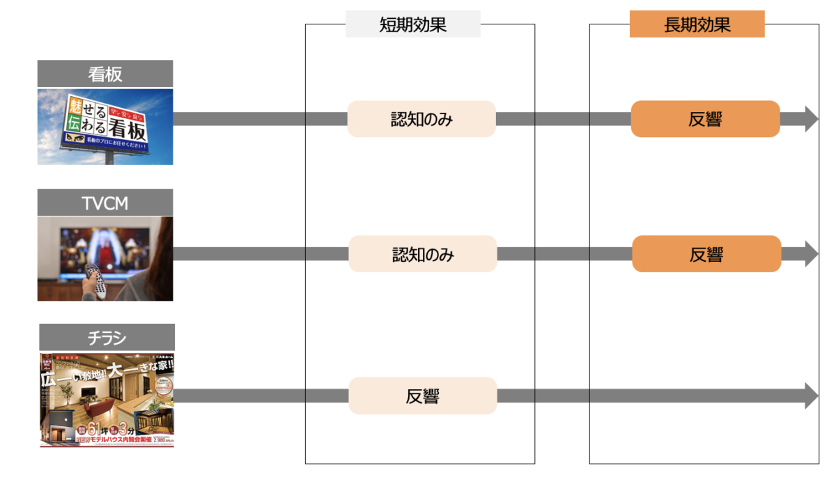 また、認知効果を狙った集客としては、テレビCMなどが当てはまる。チラシなどは短期的な効果にはなるが、長期的な効果にはつなげにくい。一方で、テレビCMや看板などは短期的な効果は見込めないが、長期的な効果になっていく。前述したように、費用対効果が読めないこれらの認知施策には、相当な忍耐力が必要になる。