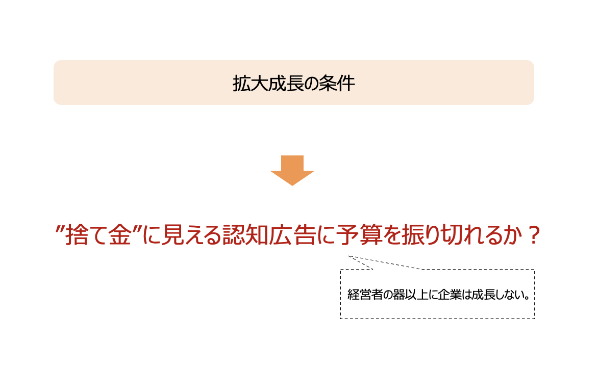 しかし、企業に圧倒的成長の条件があるとすれば、この捨て金に見える認知広告にいかに忍耐強く予算を投資し続けることができるかという点にある。
