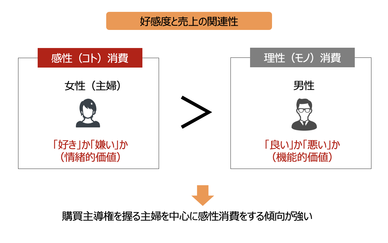 次に好感度である。好感度に関しては、下の図にあるように男性と女性で消費構造が違うことを押さえるべきである。女性は感性消費と言われるように好きか嫌いかで判断をする。