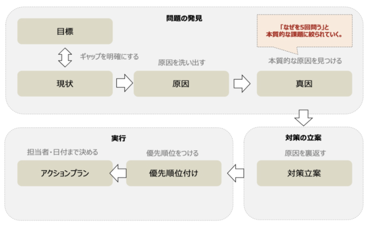 トヨタでは、このような考え方を末端の工場員までが心得ているため、現場でベルトコンベアが急に止まっても、それぞれの社員が「なぜそうなったか」を考え、的確に解決策を見いだすことで、生産性が高い組織であり続けるのである。このような考え方は、さまざまな書籍で求められているが、共通のフレームワークは下の図の通りだ。