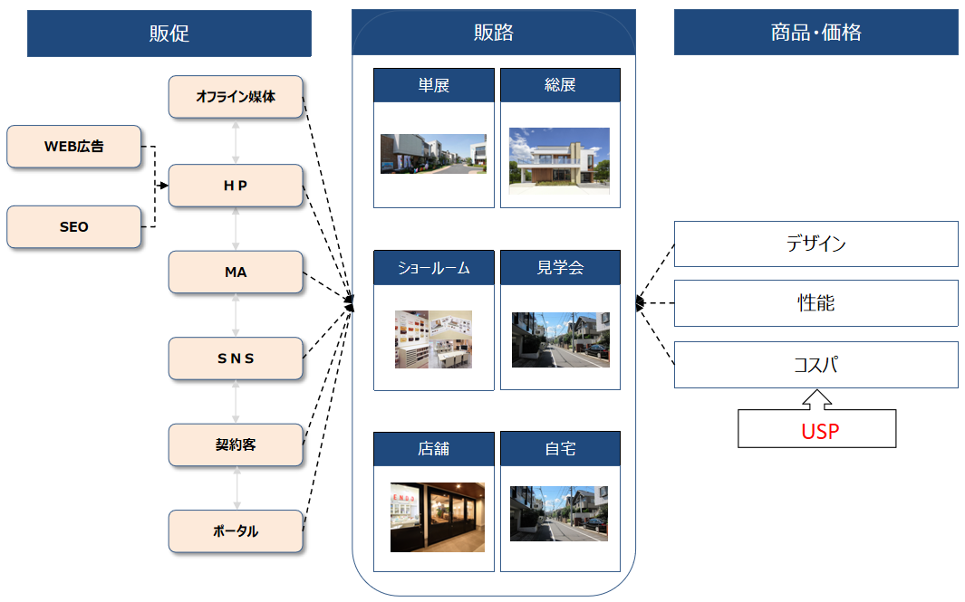端的に言えば、今回の取り組みは、この販路を総合展示場から他のルートに大きく切り替えるという意味合いを持つ。また、この販路だが、自社のサービスから逆算して設計することが重要だ。例えば、S社はデザイン性の高い「高性能な住宅」を販売していた。そのため下の図で言えば、総合展示場による集客が有効になる。