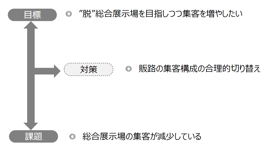 当初、S社は総合展示場の集客に依存している状態だった。しかし、総合展示場の集客が大幅に減少したことから、総合展示場メインの集客モデルから脱却するための方策を模索していた。